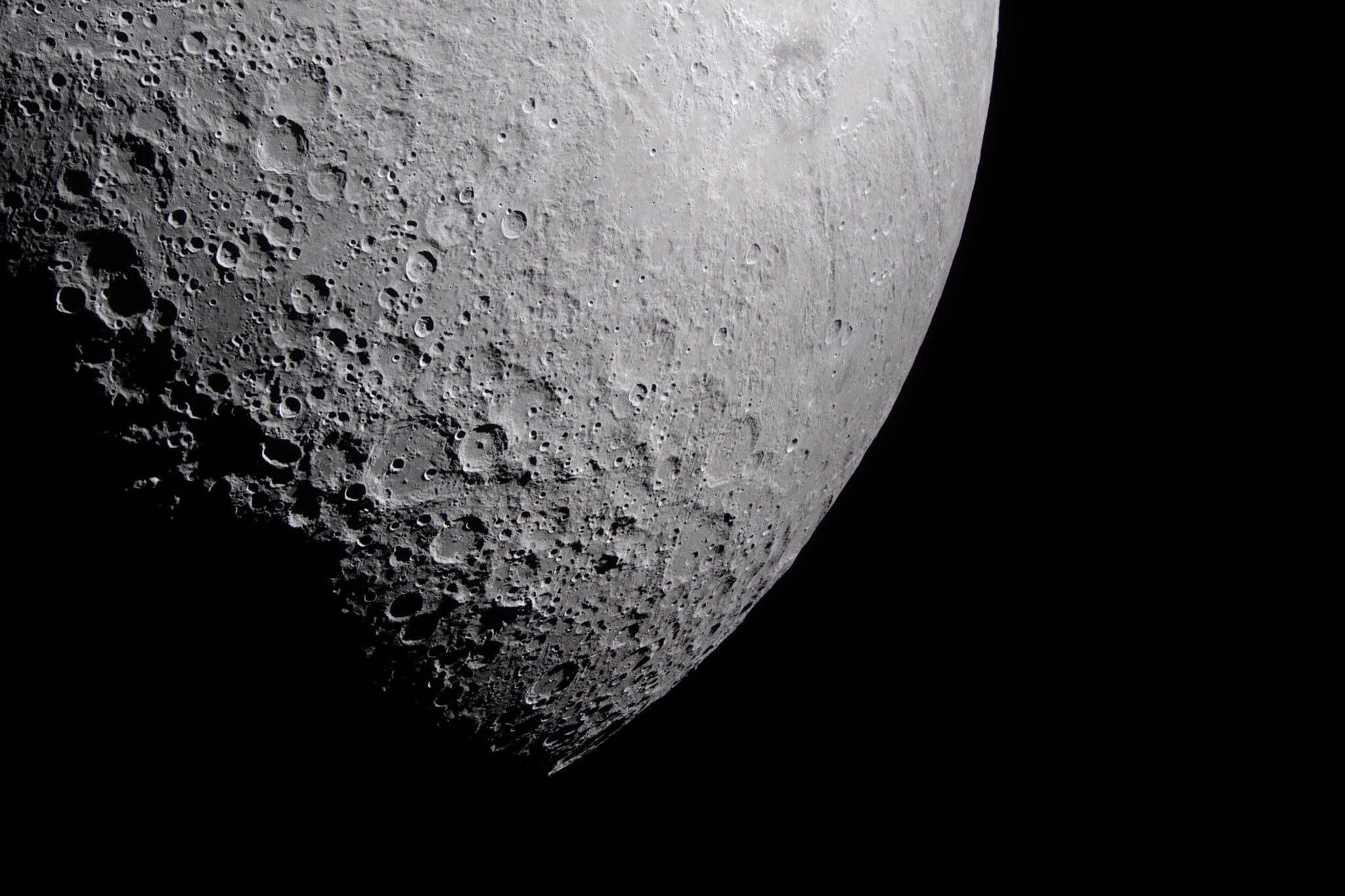 In this photo taken on April 6, 2026, a portion of the Moon’s far side is seen along the terminator—the boundary between lunar day and night—where low-angle sunlight casts long shadows across the surface.